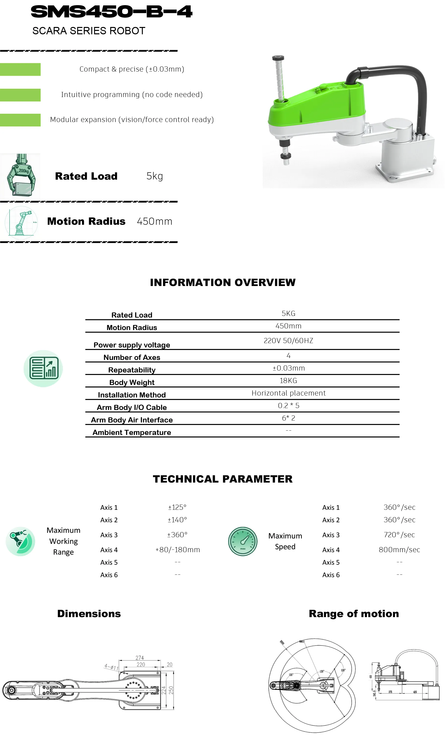 SMS450-B-4 is a newly developed small 4 axis SCARA robot with 5kg manipulator and 450mm motion radius.