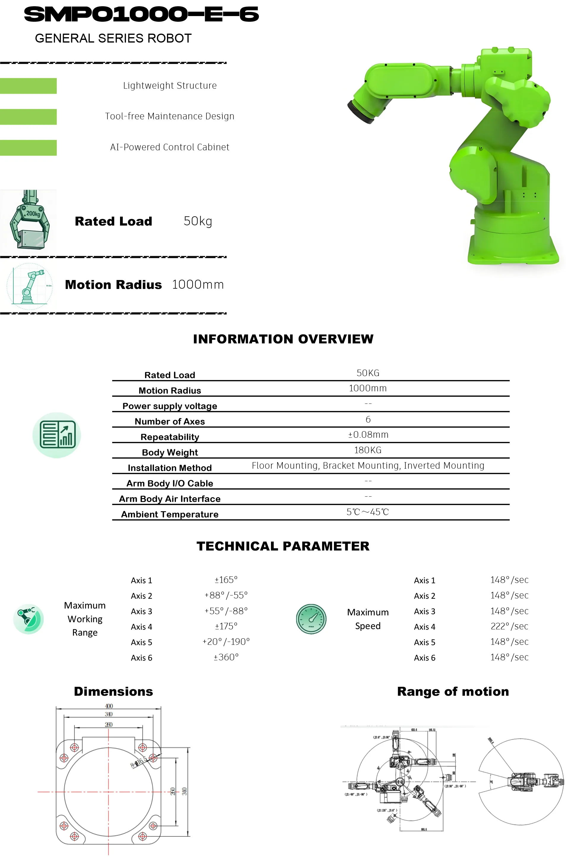 Description: SMPO1850-3C-6 is a newly developed 30kg manipulator with a large range of motion. This model has a built-in grinding process package, which can easily complete the grinding tasks delivered by customers.