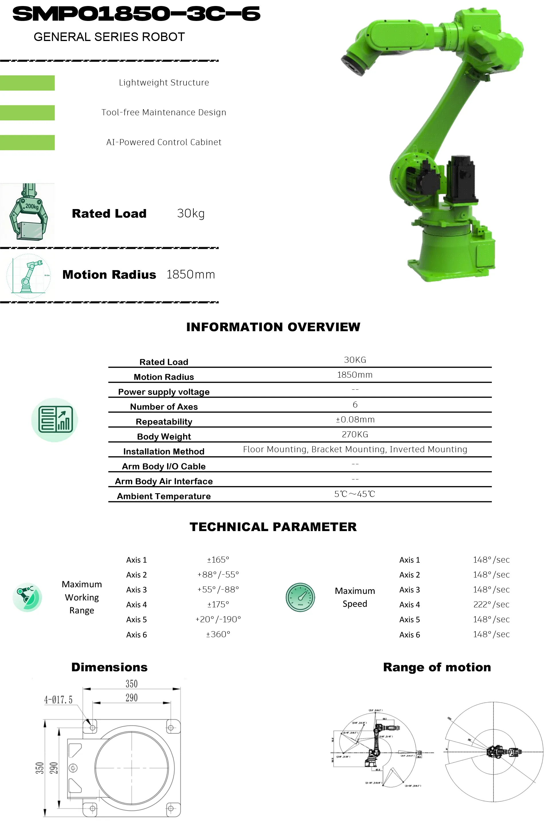 SMPO1850-3C-6 is a newly developed 30kg manipulator with a large range of motion. This model has a built-in grinding process package, which can easily complete the grinding tasks delivered by customers.