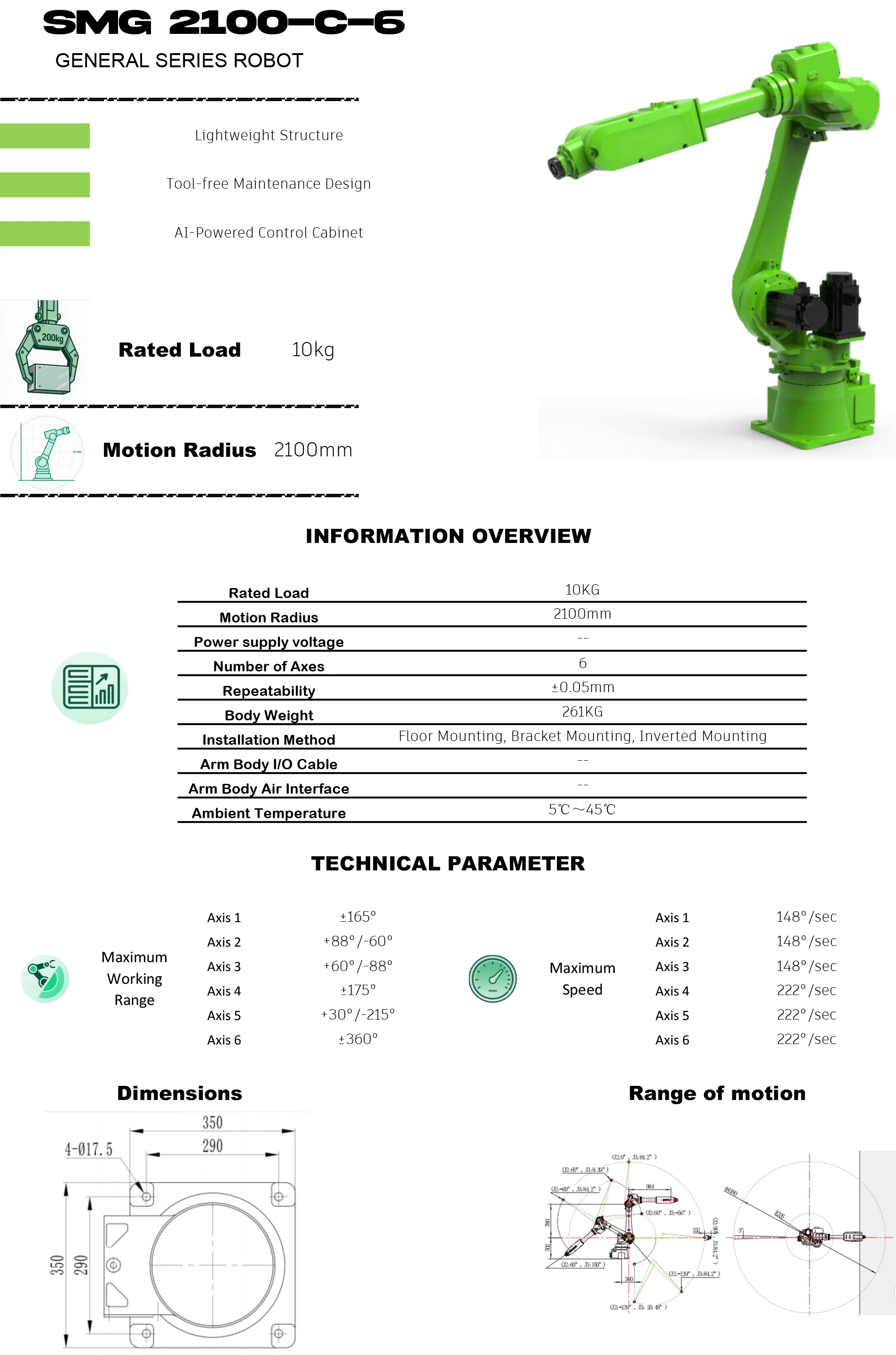 The SMG2100-C-6 robot has a load capacity of 10 kg and is widely used in handling, spraying, loading and unloading of machine tools, screwing and adhesive film. A six-axis joint robot can work independently and efficiently in a unitized production process.
