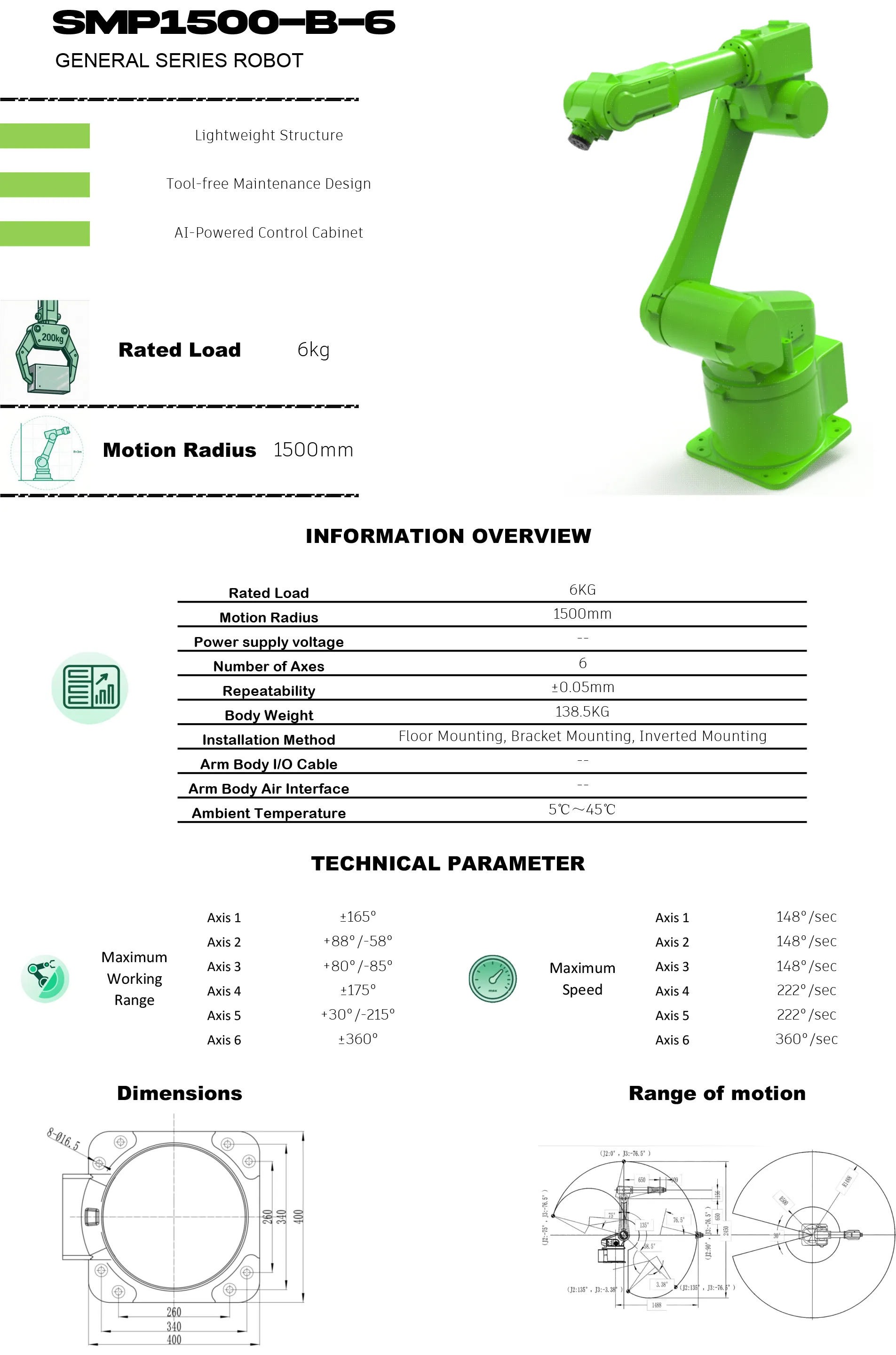 SMP1500-B-6 is the longest-running spraying robot of our company. It has a load of 6kg and an arm span of 1500mm. It is usually integrated with various non-standard turntables or hanging line equipment to form an integrated workstation. It greatly saves labor costs and improves the yield rate.