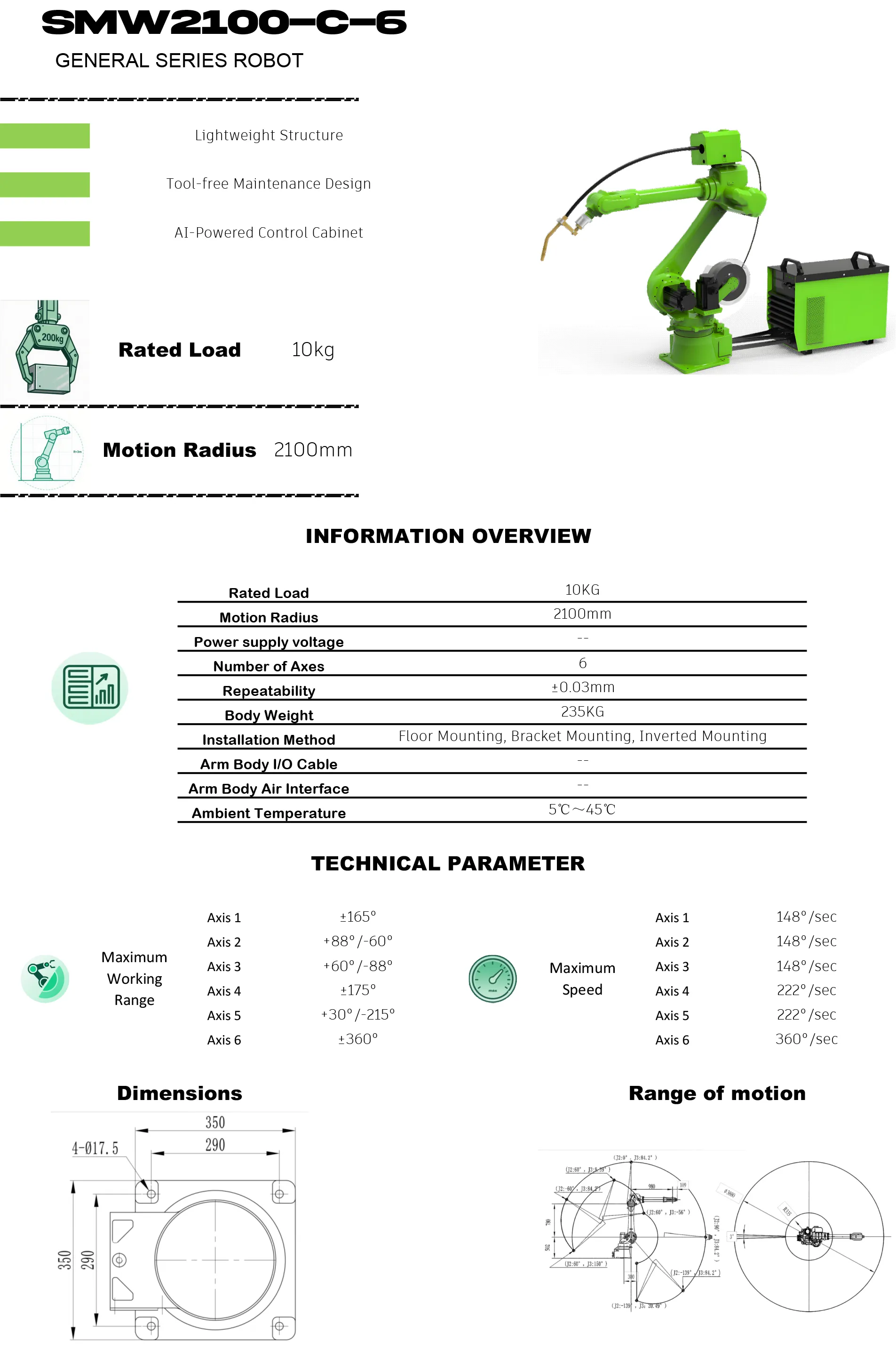 Description: The SMW1500-C-6 robot is specially used in the field of welding. It is a robot developed for customers in more severe on-site environments. Compared with previous products, this product has a larger installation area and a stable structu...