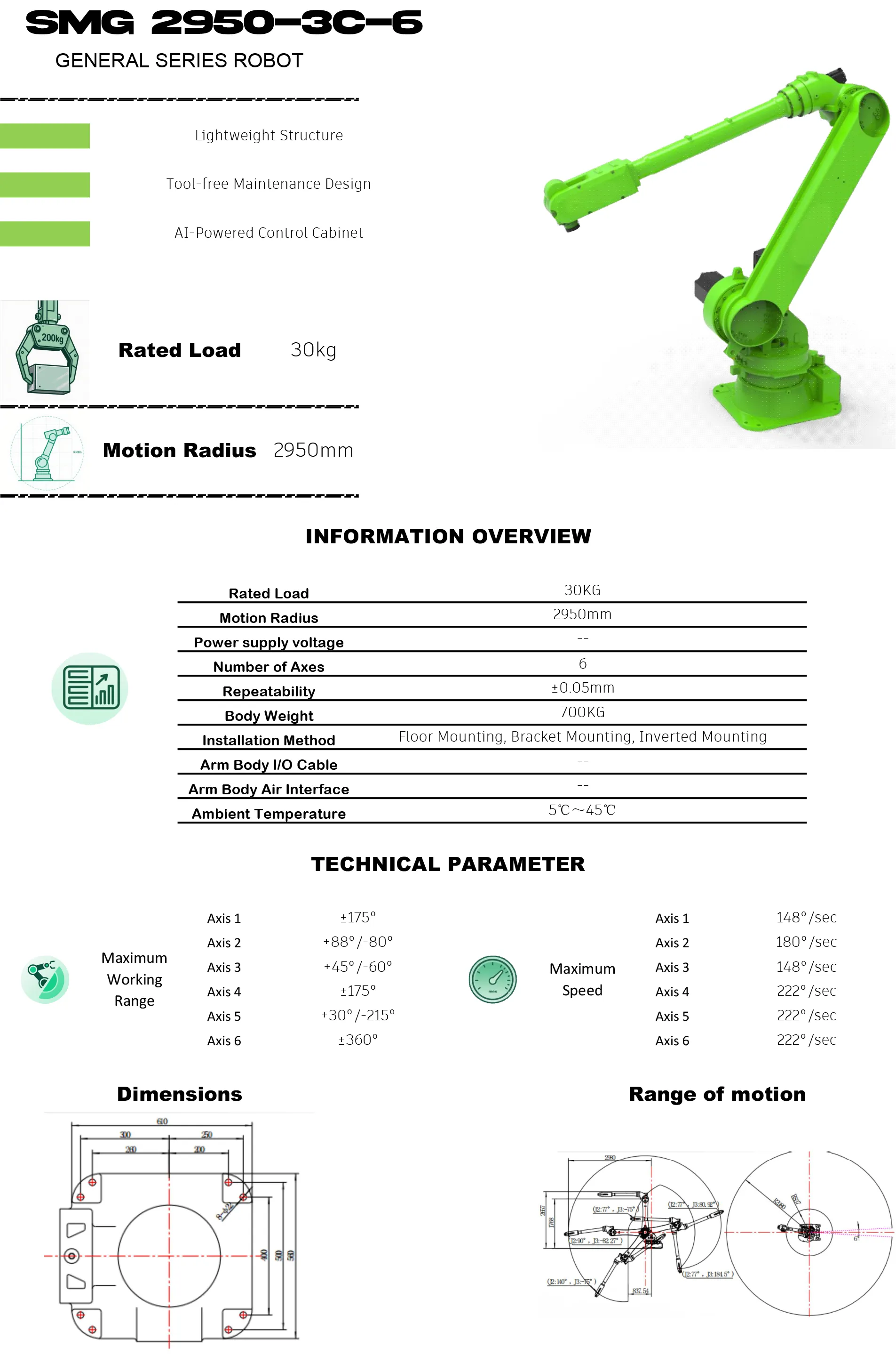 Description: The SMG2300-3C-6 robot has a load capacity of 30 kg and is widely used in handling, spraying, loading and unloading of machine tools, screwing and adhesive film. A six-axis joint robot can work independently and efficiently in a unitized...